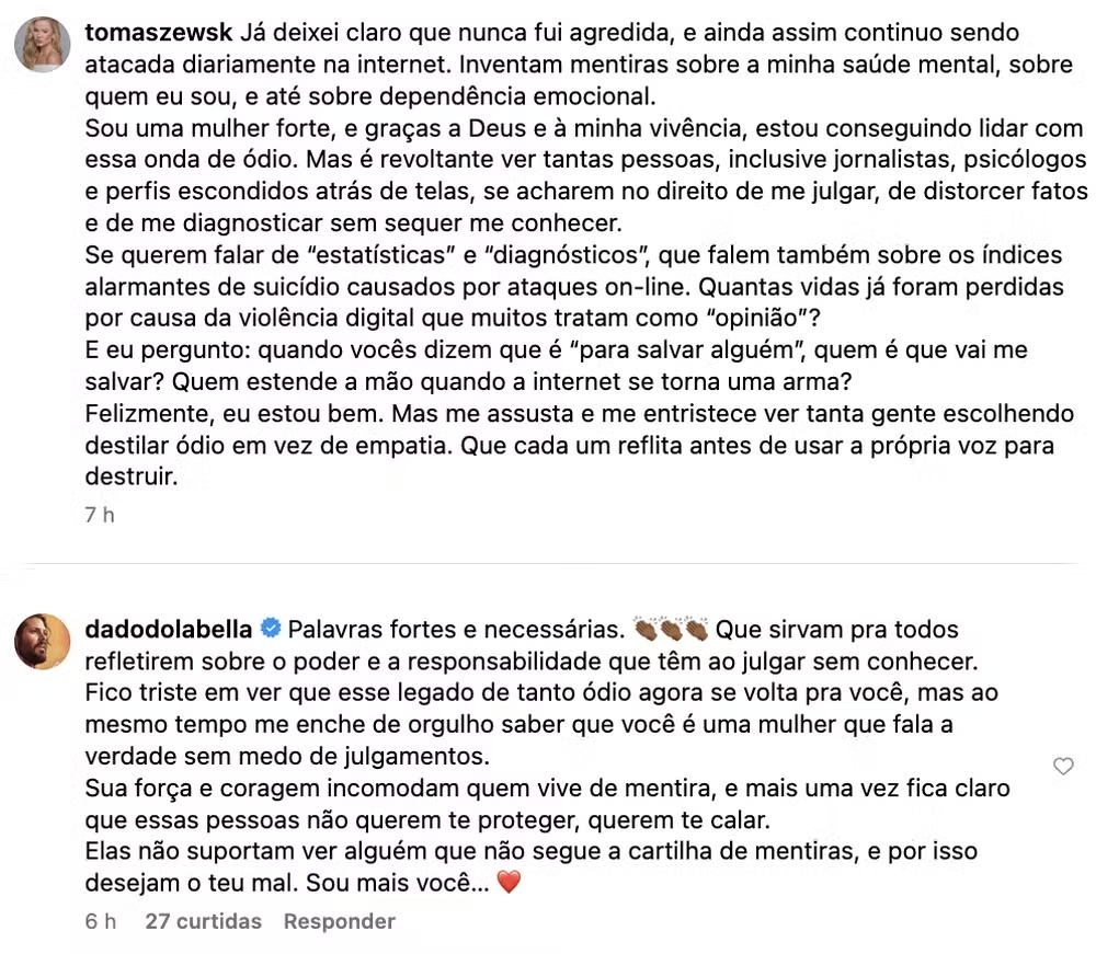 Dado Dolabella curtiu a publicação e escreveu um comentário em apoio à namorada. “Palavras fortes e necessárias. Que sirvam pra todos refletirem sobre o poder e a responsabilidade que têm ao julgar sem conhecer. Fico triste em ver que esse legado de tanto ódio agora se volta pra você, mas ao mesmo tempo me enche de orgulho saber que você é uma mulher que fala a verdade sem medo de julgamentos”, escreveu o ator.