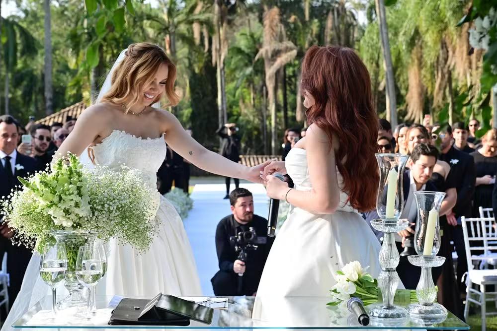 A cerimônia reúne cerca de 250 convidados, entre familiares, amigos e vários famosos, incluindo Xand Avião, Lauana Prado, Manu Bahtidão, Gkay e Deolane Bezerra. Um detalhe que chamou atenção: as noivas pediram para que os convidados usassem roupas pretas.
