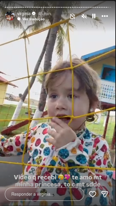 Virginia Fonseca, de 26 anos de idade, compartilhou nos stories do Instagram nesta quinta-feira (13) um vídeo que recebeu da filha, Maria Alice, de 4 anos, dizendo que estava com saudades dela. A criança está na Fazenda Talismã, ao lado dos irmãos, Maria Flor, de 3, e José Leonardo, de 1, juntamente com a avó Poliana Rocha, de 48. Enquanto isso, Virginia está em São Paulo, ontem (12) ela participou do Leilão Galácticos promovido pelo casal Celina Locks e Ronaldo.