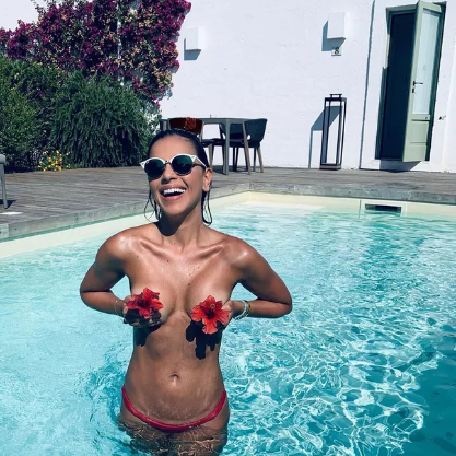 A atriz aproveitou a privacidade de um hotel de luxo para nadar e tomar sol à vontade, e explicou: "Definitivamente eu não tenho maturidade para ficar num quarto com piscina"!