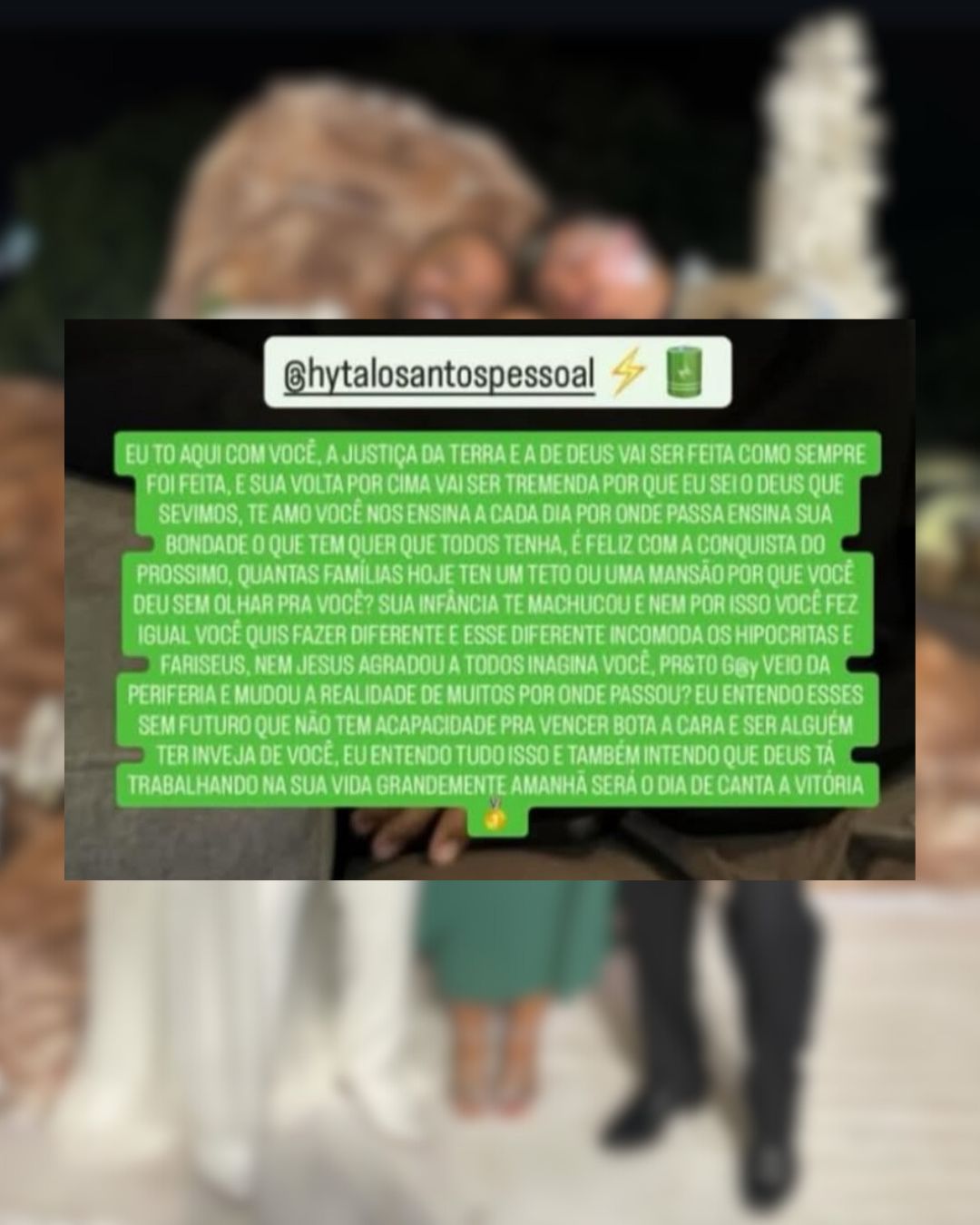 O marido também relembrou as dificuldades enfrentadas por Hytalo na infância e ressaltou que, apesar das marcas, ele decidiu seguir um caminho diferente. Segundo Euro, esse posicionamento incomoda “hipócritas e fariseus”. “Nem Jesus agradou a todos, imagina você, preto, gay, veio da periferia e mudou a realidade de muitos por onde passou”, afirmou.