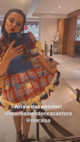 "Arraiá das Patroas. Mirei na Emília e acertei a Chiquinha! Tô mi achani... Tenho que falar que essa mega produção foi feita por mim com as roupas da minha irmã! Muito obrigada pelos empréstimos! Tô arrazani num tô??", disse Maiara em uma das publicações.