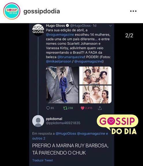 A curtida não passou despercebida pelos internautas que ficaram irritadíssimos com a situação! "Marina Ruy Barbosa, a feminista, a mulher que defende mulheres e odeia comparações. Porque para atuar em novelas é tão ruim e para manter esse papel de vítima é ótima? Ontem você falou que não aguenta mais rivalidade e hoje curte comentário diminuindo uma mulher e sua beleza", comentou uma moça.