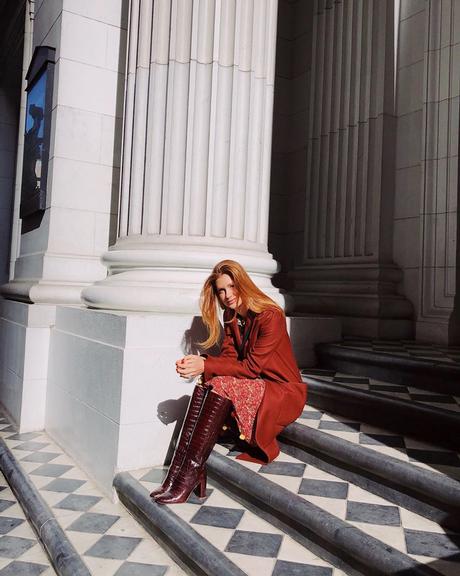 Com look elegante, a ruiva posou para as fotos com o marido e também sozinha na linda arquitetura da região.
