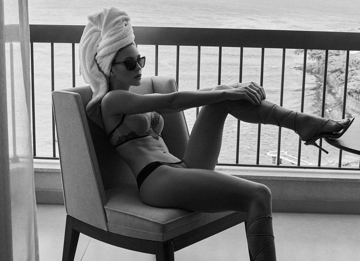 Marina Ruy Barbosa compartilhou com os fãs no Instagram uma bela foto em preto e branco em que aparece apenas de calcinha e sutiã, com uma toalha enrolada na cabeça. Na imagem deste sábado (18), ela está sentada em uma poltrona, em uma varanda, com o mar ao fundo, arrumando a sandália de salto altíssimo.