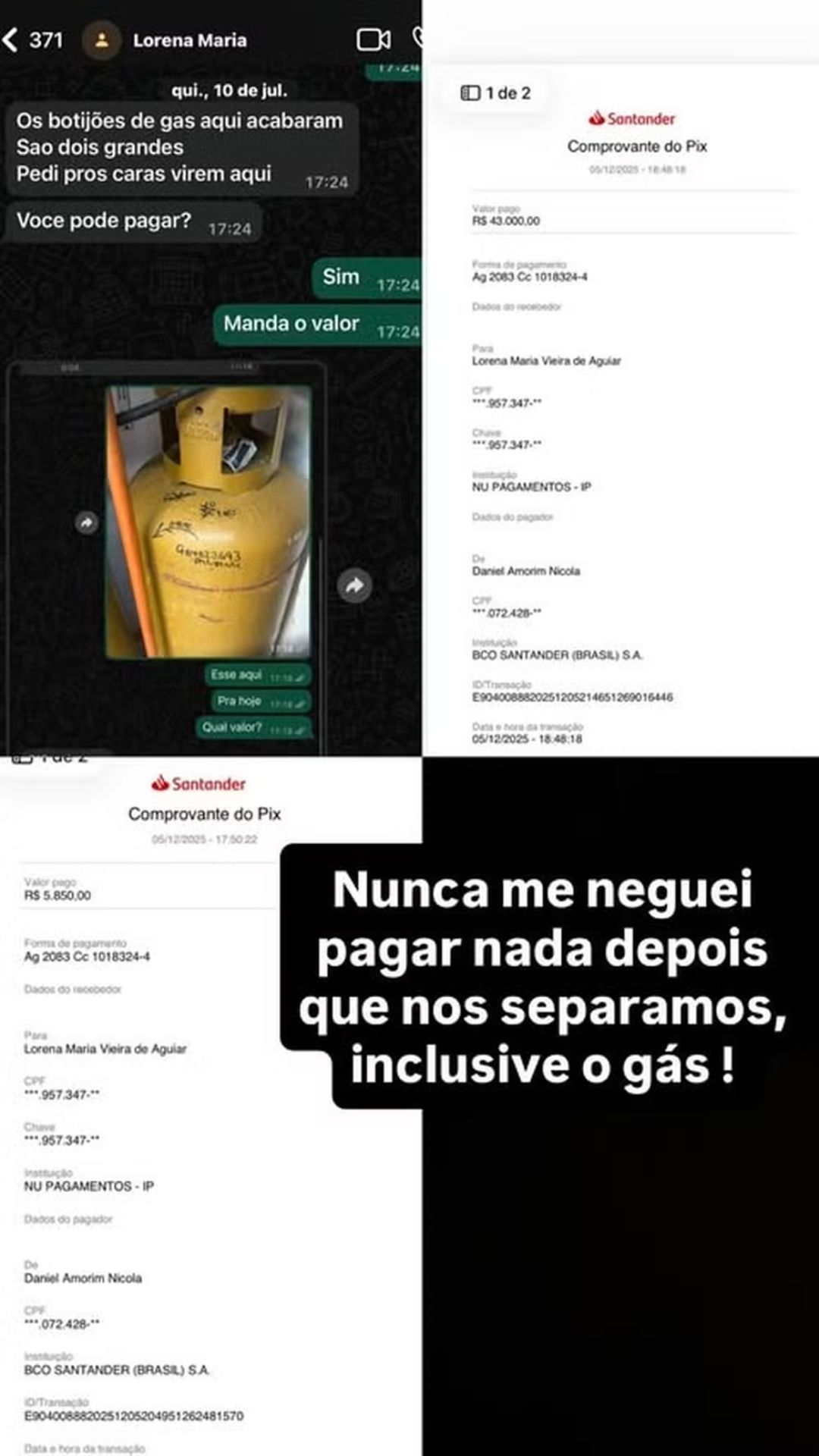 Sobre a acusação de não pagar pensão ou negar fraldas ao filho, MC Daniel afirmou que cumpre suas responsabilidades financeiras. "Se tem uma lei que funciona no Brasil, é a de pensão. Se eu não pagasse pensão para o meu filho, eu estaria preso", disse. Ele acrescentou que mantém um acordo verbal com Lorena para arcar com aluguel de R$ 29 mil, babás em tempo integral, convênio médico e demais despesas da casa.