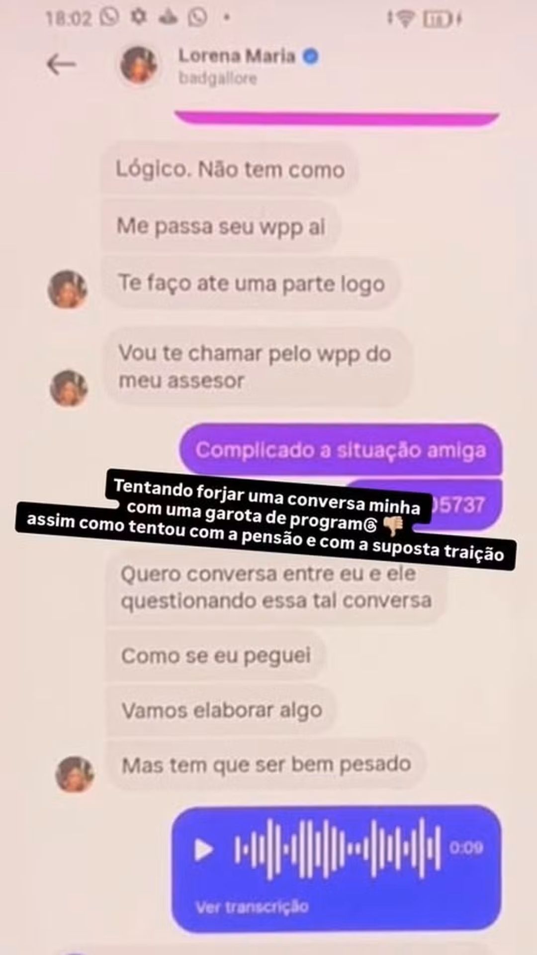 O funkeiro reforçou que as mensagens mencionadas aconteceram antes do início oficial do namoro. "Fiquei com a menina em junho, eu comecei a namorar em agosto. Então, eu não estava namorando ela [Lorena Maria]. Ela sabe que eu não estava namorando ela. Tanto que ela descobriu essas mensagens em janeiro deste ano, ela não terminou comigo. Dormi e ela pegou meu celular escondida e acessou meu celular porque ela tinha a senha, eu não tinha a senha do celular dela", relatou.