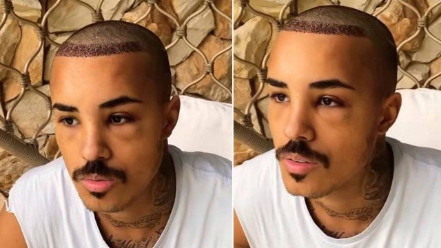 "Eu não segui totalmente as recomendações. É muito difícil. Falaram que eu podia fazer atividade física e ter relações. As atividades físicas, tranquilo. Mas o mais difícil era mexer no celular olhando para baixo. Como tomei muitas anestesias, ficou muito líquido aqui (aponta para testa). E a minha testa ficou bastante inchada no primeiro dia. Isso ocasionou que o líquido das anestesias acabou descendo para o meu olho. Agora estou assim", conta ele, que tirou 140 fios da parte de trás da cabeça e implantou na região da frente.