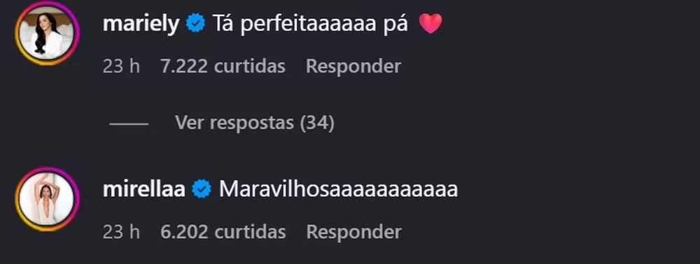 O episódio foi reforçado pelos comentários das próprias gêmeas nas redes sociais. Mariely respondeu a uma foto de Lomma com “Tá perfeita, Pá”, enquanto Mirella comentou “Maravilhosa!”, demonstrando que não há conflitos entre elas.