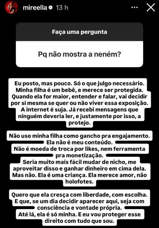 "Ela merece amor, não holofotes. Quero que ela cresça com liberdade, com escolha. E que, se um dia decidir aparecer aqui, seja com consciência e vontade própria. Até lá, ela é só minha. E eu vou proteger esse direito com tudo que sou", concluiu.