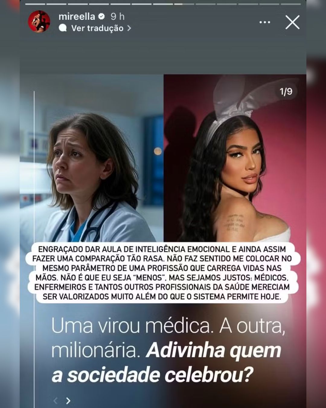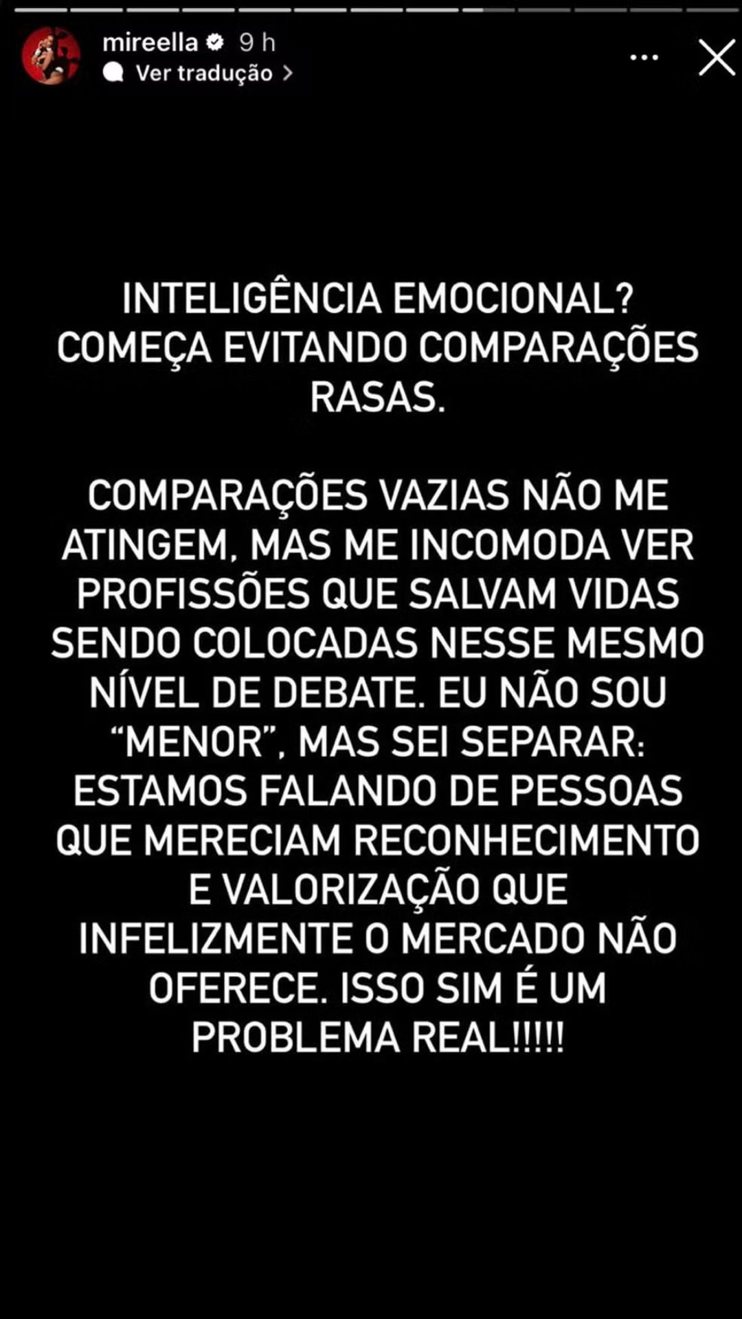 "Engraçado dar aula de inteligência emocional e ainda assim fazer uma comparação tão rasa. Não faz sentido me colocar no mesmo parâmetro de uma profissão que carrega vidas nas mãos. Não é que eu seja 'menos', mas sejamos justos: médicos, enfermeiros e tantos outros profissionais da saúde mereciam ser valorizados muito além do que o sistema permite hoje", afirmou Mirella.