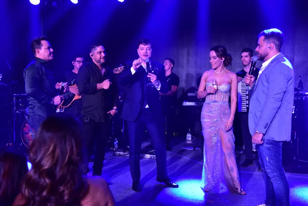 Diogo cantou para o aniversariante e a mulher, Georgia Alarcão, e os filhos do casal, Rafaela Alarcão e Alessandro Alarcão Filho. O namorado de Paolla Oliveira ainda alvoroçou os convidados ao distribuir rosas durante sua apresentação.