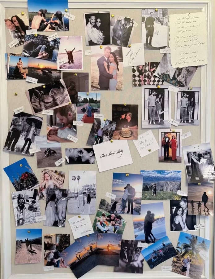 As imagens, reunidas em um quadro intitulado "Nossa História de Amor", retratam a trajetória de Harry e Meghan desde o início do relacionamento, em 2016, passando pelo noivado e o casamento. Meghan também incluiu um ultrassom da gravidez de Archie, uma foto em que aparece grávida e outra de Harry inclinado sobre o bebê logo após o nascimento. Há ainda um registro de Lilibet recém-nascida, alguns momentos das crianças e diversas fotos do casal ao longo dos anos.