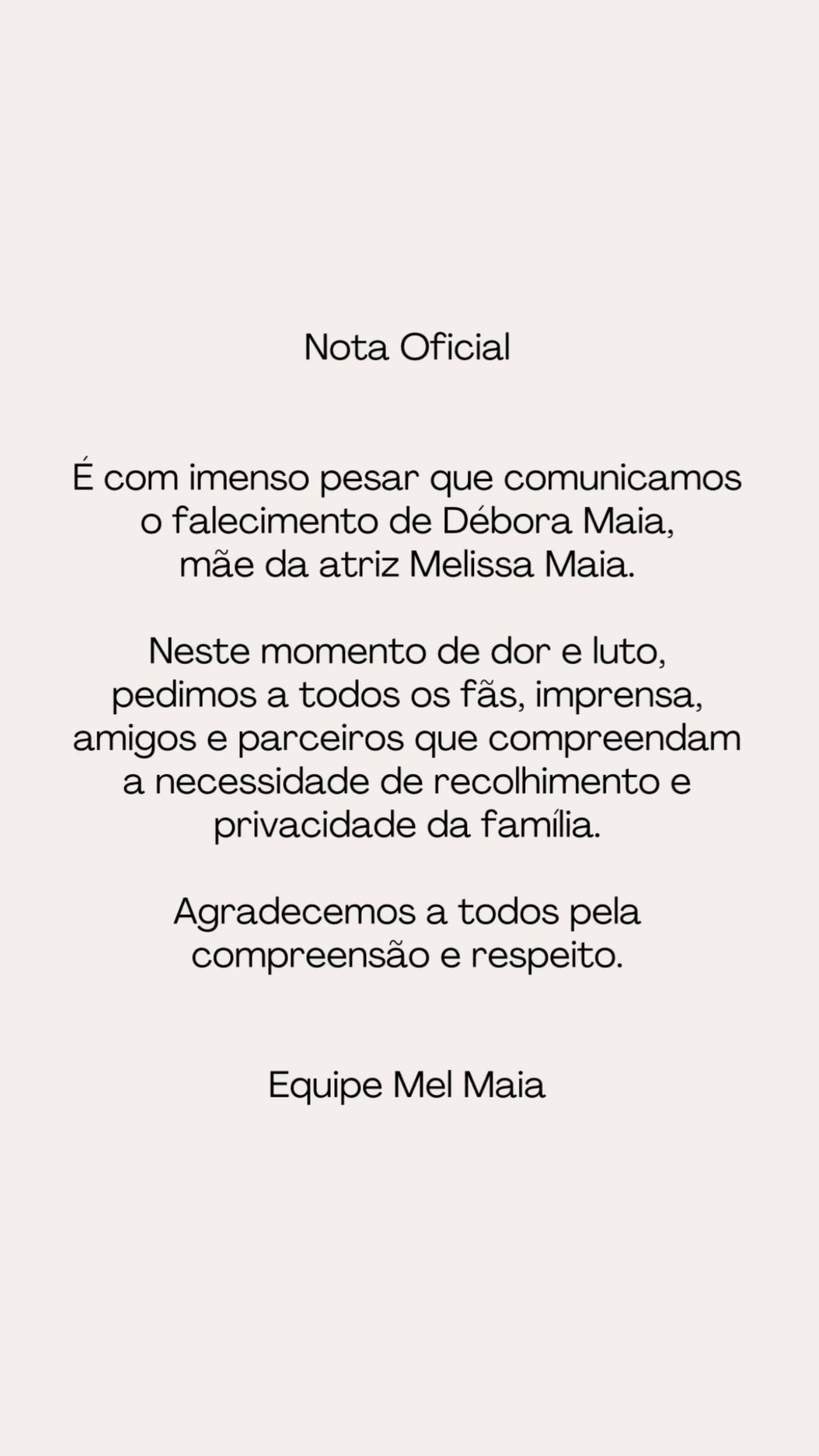 É com imenso pesar que comunicamos o falecimento de Débora Maia, mãe da atriz Melissa Maia.