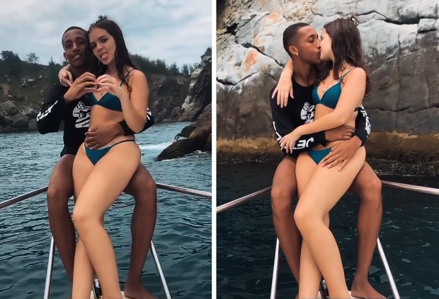 Mel Maia troca beijos com o namorado durante passeio de barco