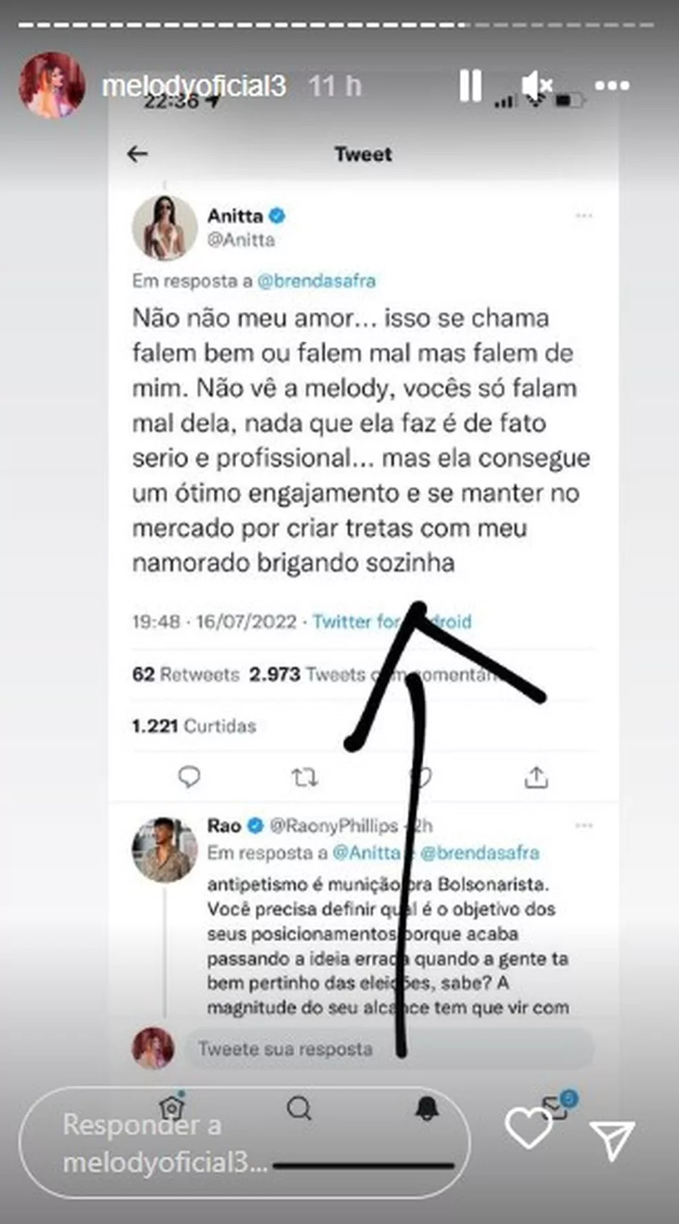 "Estão me marcando demais aqui, que a Anitta tá falando que eu não paro de arrumar briga com ela, mas quem está falando meu nome? Quem está citando meu nome é ela, quem não tira meu nome da boca é ela", disse Melody, após ver uma print em que a Poderosa realmente cita seu nome.