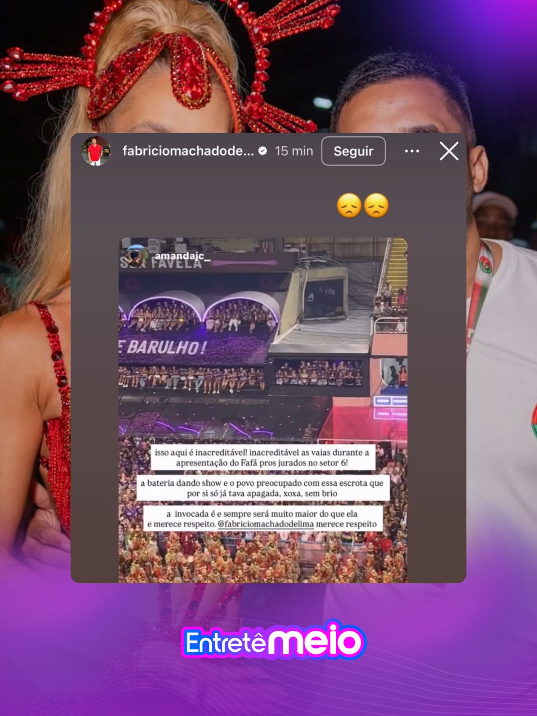 “Isso aqui é inacreditável! inacreditável as vaias durante a apresentação do Fafá pros jurados no setor 6!. A bateria dando show e o povo preocupado com essa escrota que por si só já tava apagada, xoxa, sem brio. A invocada é e sempre será muito maior do que ela e merece respeito @/fabriciomachadodelima merece respeito”, diz o repost.
