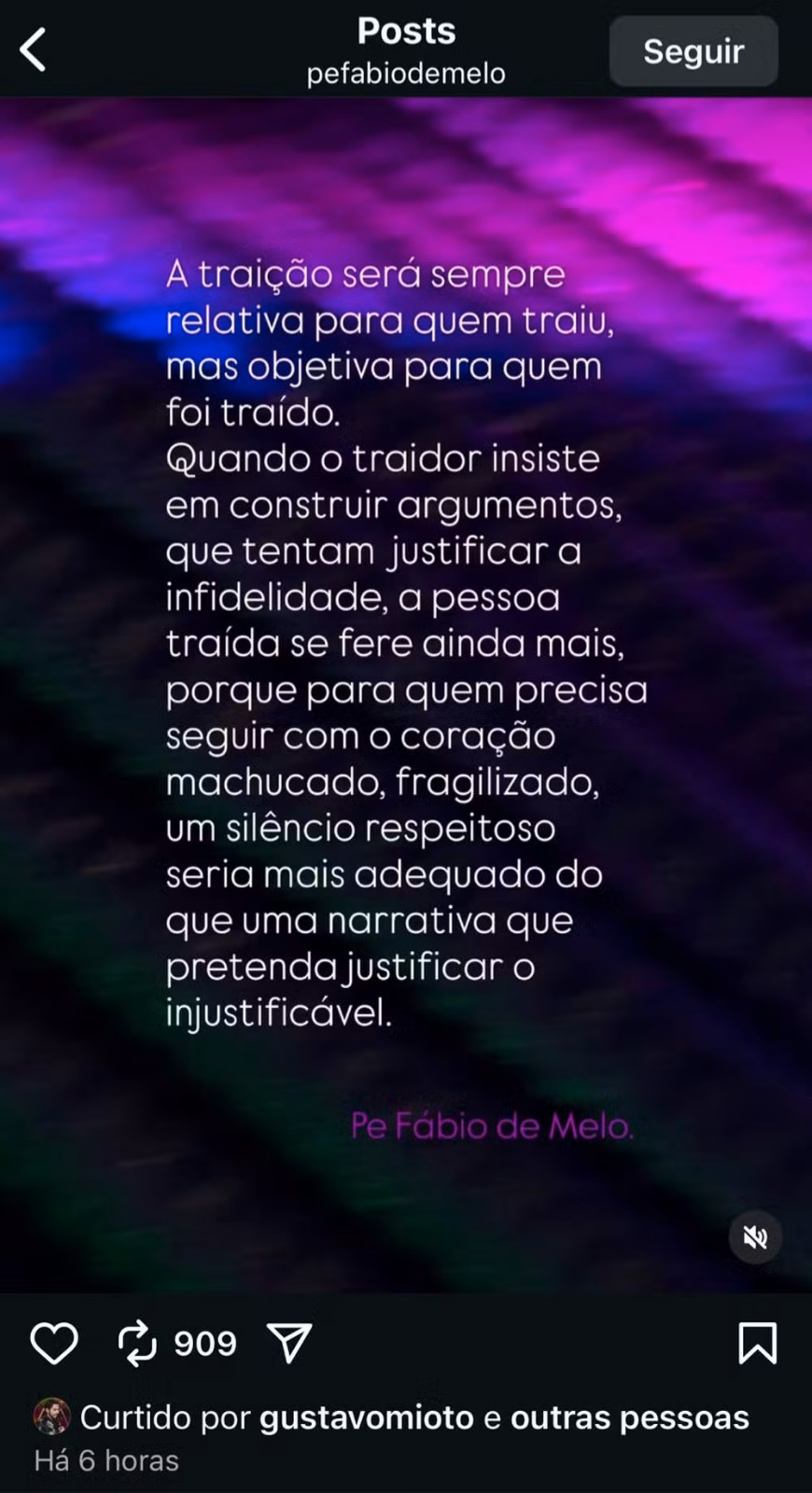 “A traição será sempre relativa para quem traiu, mas objetiva para quem foi traído. Quando o traidor insiste em construir argumentos que tentam justificar a infidelidade, a pessoa traída se fere ainda mais (…) um silêncio respeitoso seria mais adequado do que uma narrativa que pretenda justificar o injustificável”, dizia a mensagem.