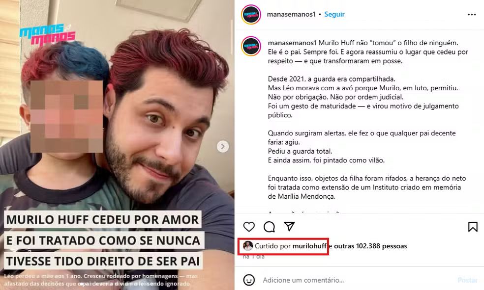 O cantor curtiu recentemente uma publicação nas redes sociais que o defendia das críticas em torno da decisão judicial. O texto dizia que ele “não tomou o filho de ninguém”, reforçando que “sempre foi o pai” e que, na época da perda de Marília, permitiu que o menino morasse com a avó por estar em luto, sem que houvesse imposição legal. “Foi um gesto de maturidade — e virou motivo de julgamento público”, dizia a publicação.