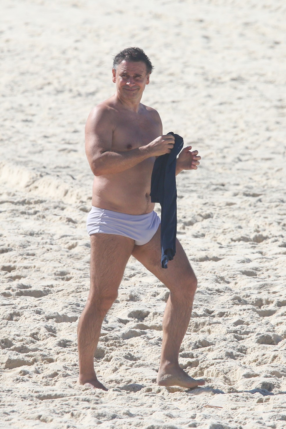 Murilo Rosa, de 55 anos, aproveitou o início da semana para relaxar em uma praia na Barra da Tijuca, na Zona Sudoeste do Rio de Janeiro, ao lado da esposa, a supermodelo Fernanda Tavares, de 45. O ator apareceu de sunga branca, enquanto ela apostou em um look fitness que lembrava um biquíni, completado com boné e óculos de sol.