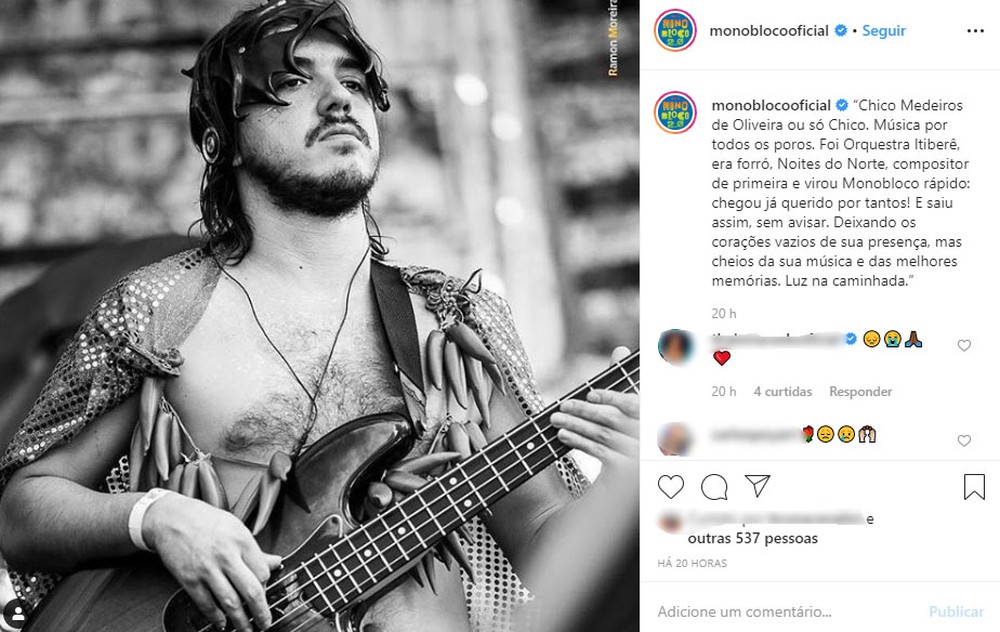 "Chico Medeiros de Oliveira ou só Chico. Música por todos os poros. Foi Orquestra Itiberê, era forró, Noites do Norte, compositor de primeira e virou Monobloco rápido: chegou já querido por tantos! E saiu assim, sem avisar. Deixando os corações vazios de sua presença, mas cheios da sua música e das melhores memórias. Luz na caminhada"