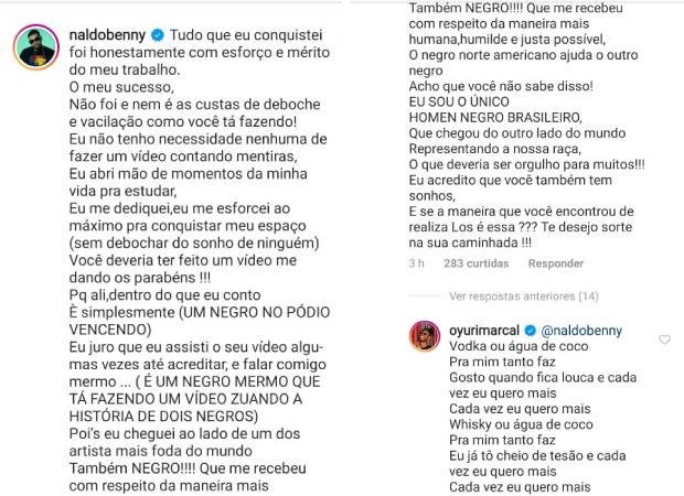 Nos comentários, Naldo mandou um recado ao comediante, mostrando estar irritado com a brincadeira. "Admiro você, preto como eu, sabendo das dificuldades, dos preconceitos que a gente enfrenta pra chegar no topo, está aí, rindo e debochando, tentando se promover em cima da conquista do outro! É por isso que o negro enfrenta tanta humilhação e desigualdade até hoje, o próprio preto debochando das conquistas da sua raça! Vergonha alheia. Aqui é favela, jow! Nós somos minoria em um país que não dá chance para o preto. Acho que você deveria ter pensado bem nas nossas lutas antes de ter feito esse vídeo", escreveu o cantor.