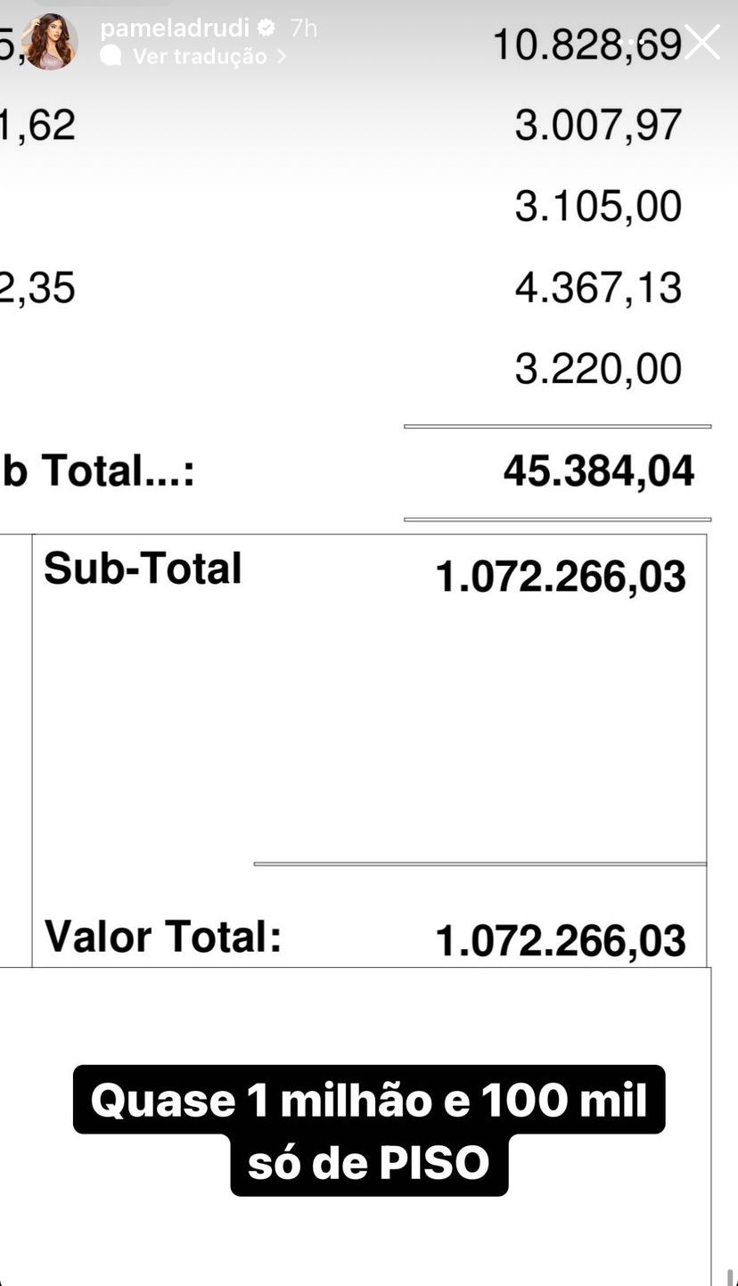 A youtuber e influenciadora digital Pâmela Drudi chocou as redes sociais ao revelar a quantia milionária que desembolsou no piso de sua casa em São Paulo. Em seus Stories,ela revelou ter gasto quase R$ 1.100.000,00.