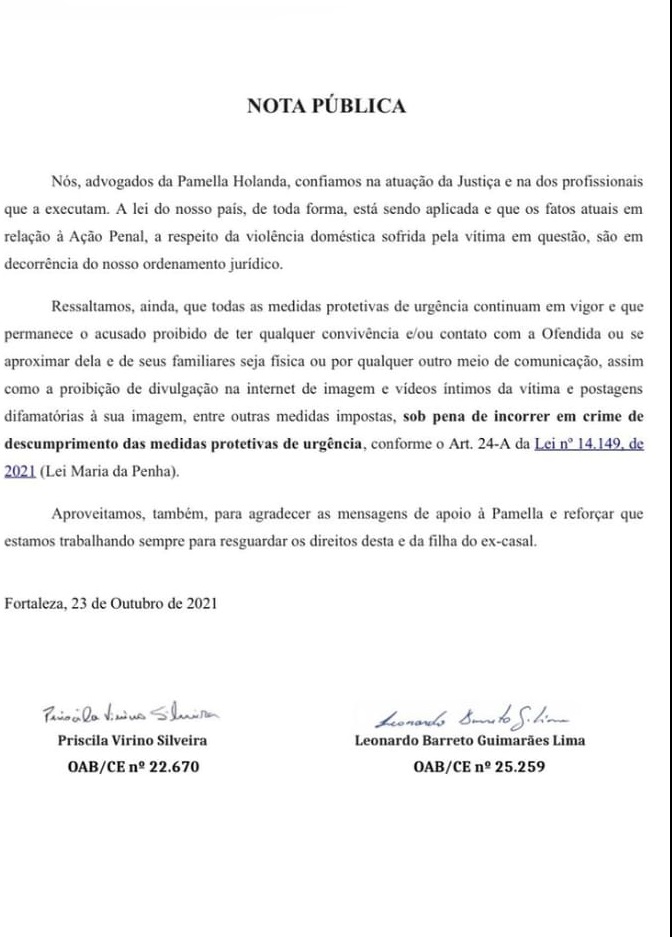 Nota Pública divulgada por Pamella Holanda em seu perfil no Instagram | FOTO: Reprodução