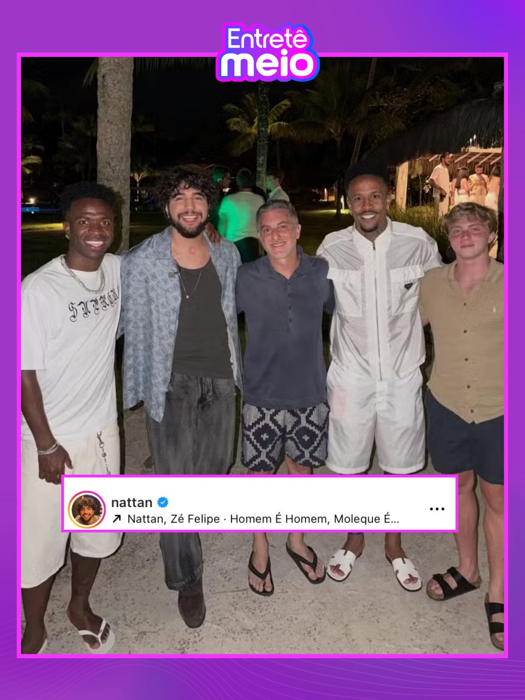 Uma publicação feita por Nattan na noite de sexta-feira (26) repercutiu nas redes sociais. O cantor compartilhou uma foto ao lado de Éder Militão, Luciano Huck e Vinícius Júnior, durante um encontro em Trancoso, na Bahia, onde o zagueiro e o atacante do Real Madrid devem passar o Ano Novo.
