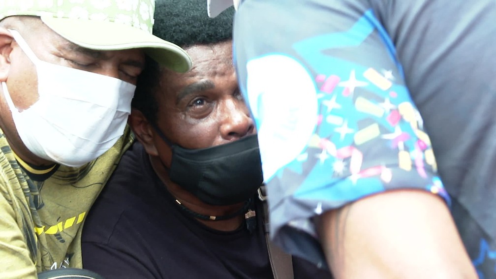 Neguinho da Beija-Flor é amparado por amigos no enterro do neto - Foto: TV Globo