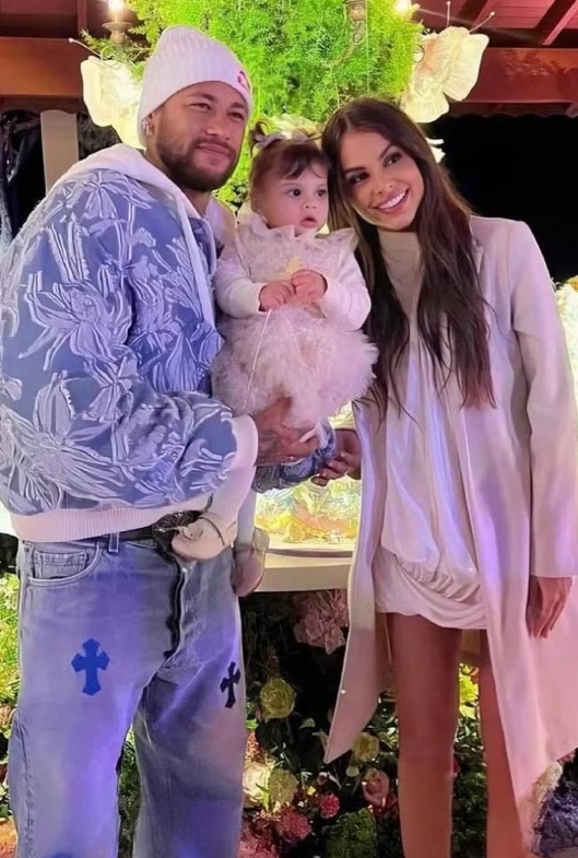 Neymar e Amanda Kimberlly posaram juntos com a filha, Helena, na festa de aniversário de 1 ano da menina, que aconteceu na tarde de quinta-feira (3), em Jundiaí, no interior de São Paulo. A foto foi compartilhada por um fã-clube da influenciadora de 31 anos, nesta sexta-feira (4). Nela, o atleta de 33 está usando uma touca branca e casaco azul.