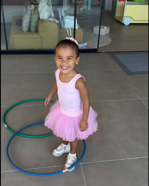 O jogador Neymar, de 34 anos, compartilhou nesta terça-feira (24) um momento divertido da filha Mavie, de dois anos. No vídeo publicado nas redes sociais, a menina aparece brincando de bambolê enquanto usa uma roupa de bailarina rosa.