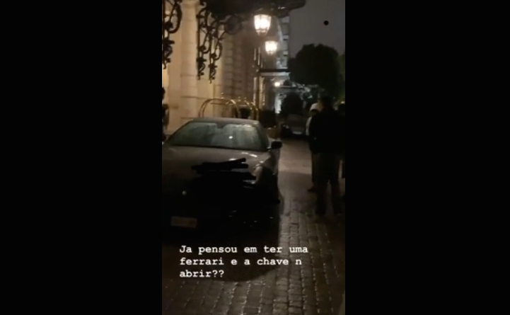 O momento foi registrado por Belle Silva, mulher do jogador Thiago Silva, e compartilhado no Instagram. "Já pensou em ter uma Ferrari e a chave não abrir? Pois é, Neymar passou por isso. No final deu tudo certo", contou ela, se divertindo.