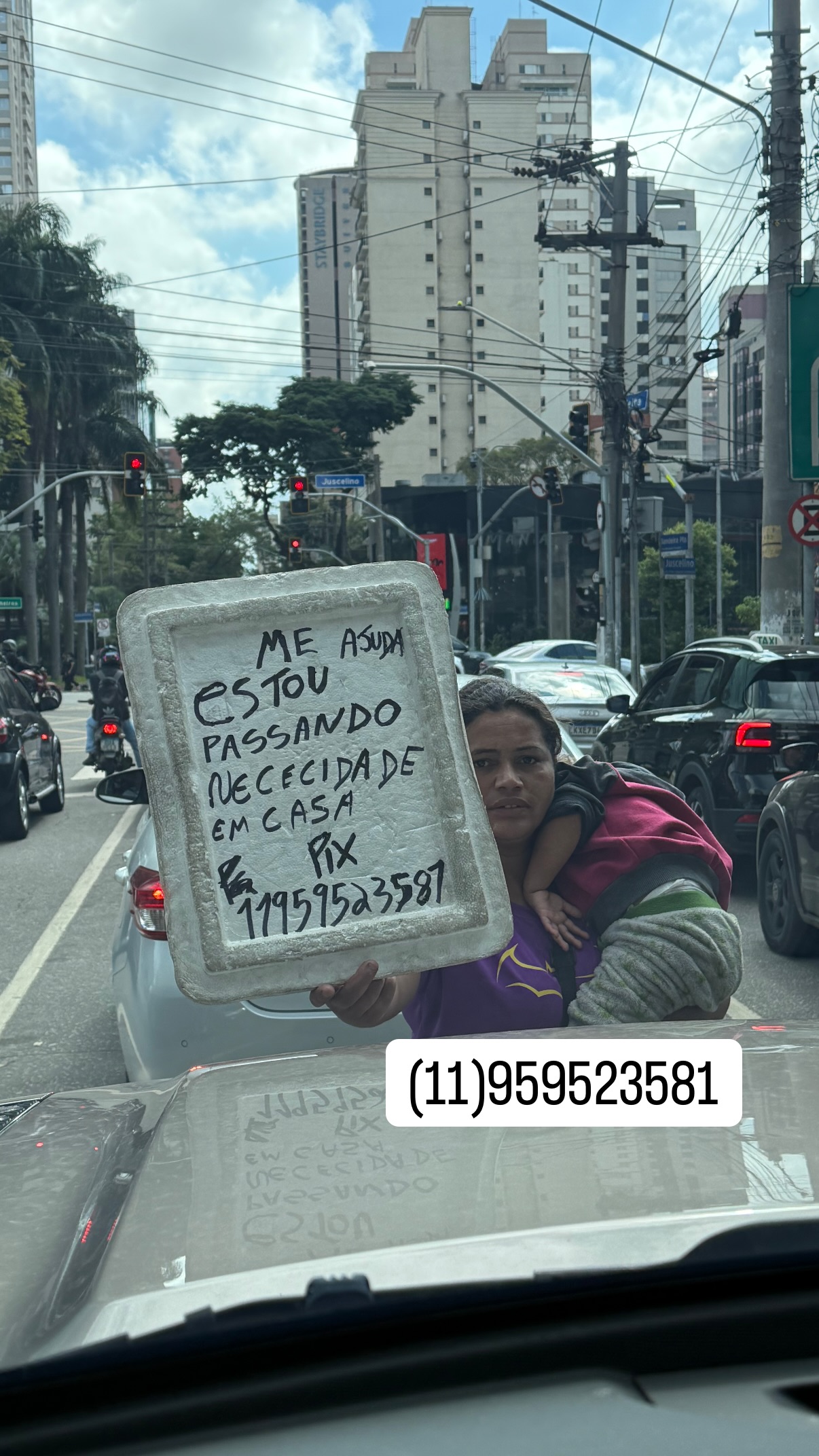 Através de seus stories do Instagram, Nicolas compartilhou uma foto com a chave Pix da mulher, que estava segurando uma placa pedindo ajuda. "Me ajuda, estou passando necessidade em casa", estava escrito na placa.