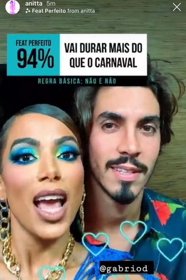 A cantora levou seu novo affair Gabriel David para curtir a festa e até arriscou um filtro onde mostra a porcentagem de quanto o casal combina. No caso da dupla, o número alcançado foi de 94% e o app disse que eles vão 'durar mais que o Carnaval'.