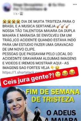 Já no caso de Maiara, saiu uma notícia sem fundamento nenhum, de que ela teria se envolvido em um acidente e morrido. “Dia de muita tristeza para o Brasil e para a música sertaneja! Nossa tão talentosa Maiara, da dupla Maiara e Maraisa, se envolveu em um trágico acidente quando estava indo para um estúdio fazer gravação de novo clipe. As pessoas que passavam pelo local do acidente gravaram algumas imagens e vídeos. As imagens são fortes“, dizia um dos trechos da tal notícia.