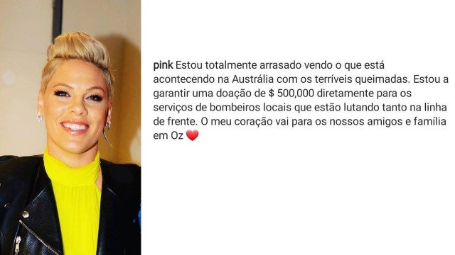 "Devastada" com os incêndios na Austrália, P!nk doou 500 mil dólares o equivante a R$ 2.033.400 milhões para serviços de emergência na Austrália, enquanto incêndios florestais devastadores estão fora de controle. A cantora confirmou a notícia em suas redes sociais, explicando que estava com o coração partido pelas chamas, e compartilhou um link para as páginas de doações, disse aos fãs. As informações são do Extra.