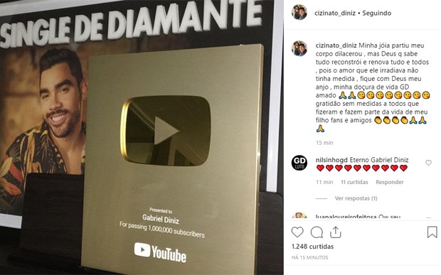 Cizinato Diniz, pai do cantor Gabriel Diniz, que morreu em um acidente aéreo na última segunda-feira (27), se pronunciou em seu perfil do Instagram após a precoce e trágica morte do filho de 28 anos. Ele postou uma imagem do single de diamante conquistado pelo cantor e fez um texto emocionante. Com informações da Quem