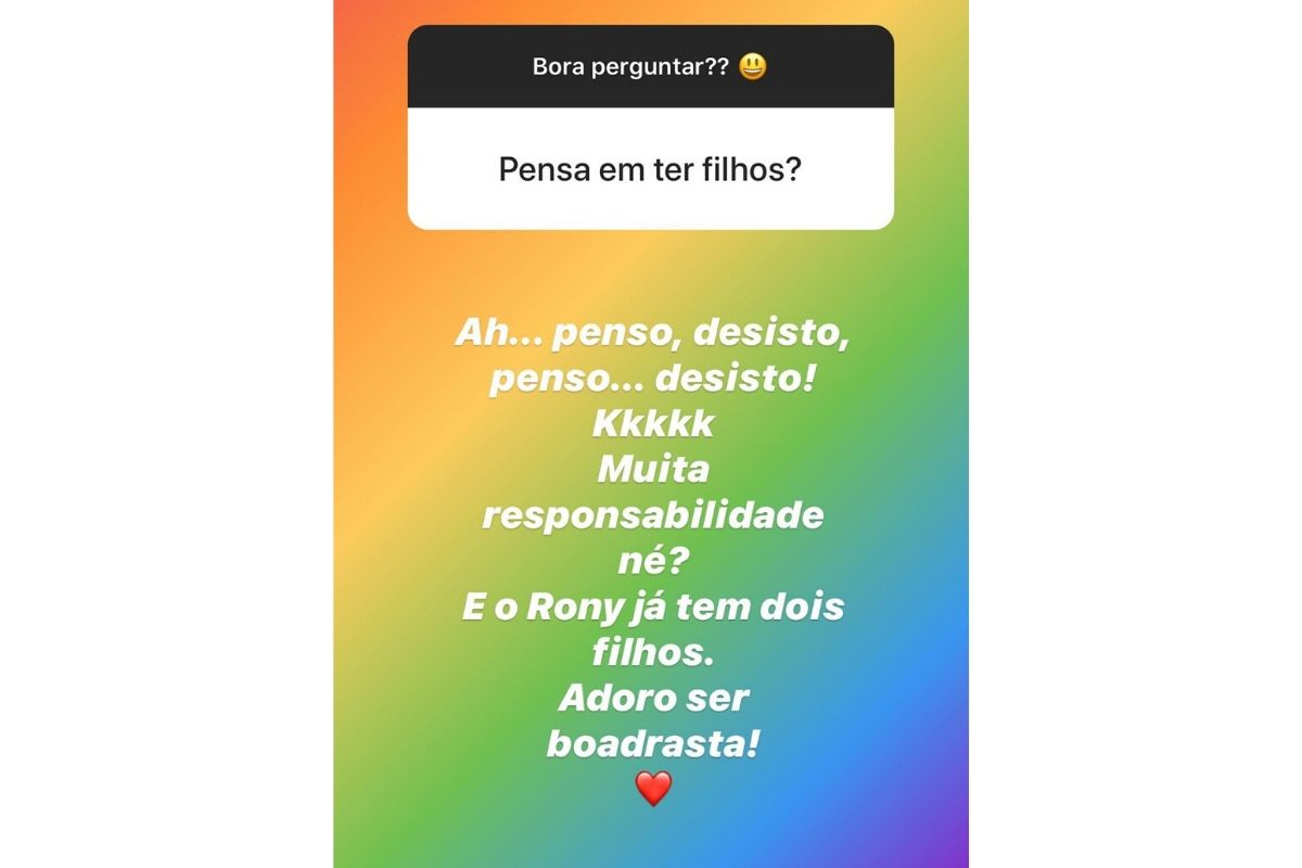 Durante a pandemia, os fãs especularam muito uma maternidade de Paula Fernandes e, sendo assim, ela respondeu questionamentos sobre o assunto nas redes sociais. “Ah, penso e desisto”, brincou ela, ao responder a uma pergunta de um internauta, e completou afirmando que, como o namorado tem dois filhos, ela é muito boa em ser “boadrasta”.