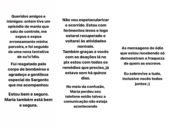 "Queridos amigos e inimigos: ontem tive um episódio de mania que saiu do controle, me expus e expus erroneamente minha parceira, e foi seguido de uma nova tentativa de suicídio. Fui resgatado pelo corpo de bombeiros e agradeço de coração a gentileza especial do Sargento que me acompanhou. Estou bem e seguro. Maria também está bem e segura... No meio da confusão, Maria perdeu seu telefone, então, talvez a comunicação não esteja acontecendo."