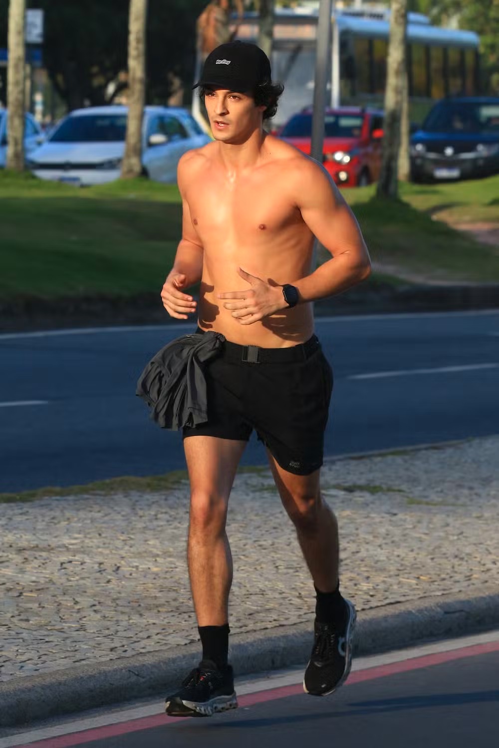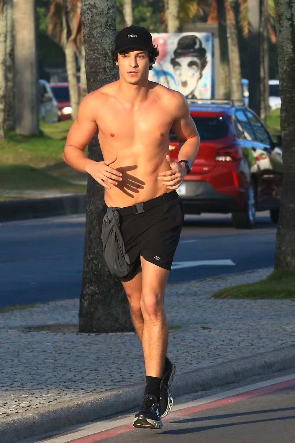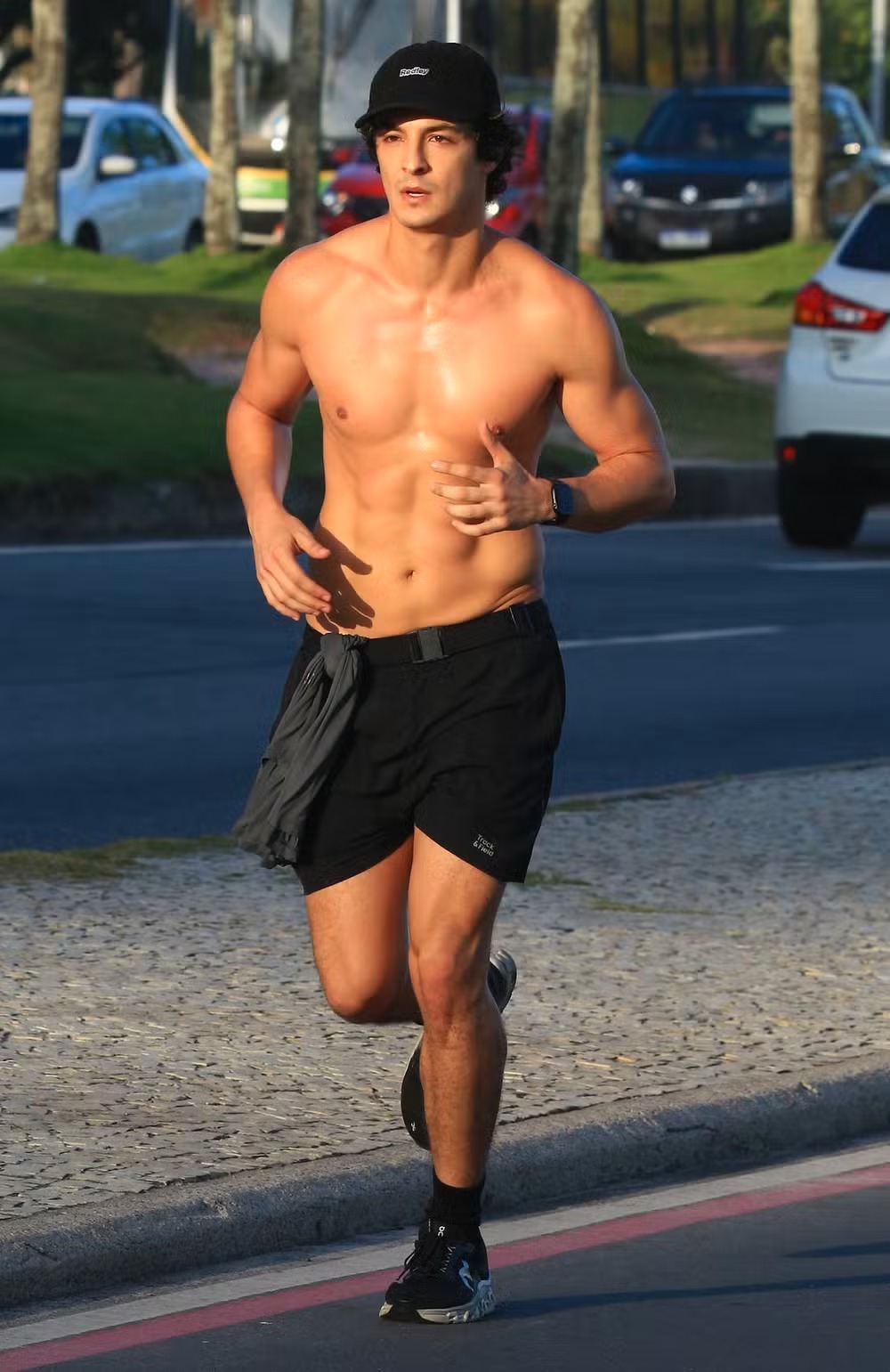 Nas fotos, Pedro aparece durante o treino, correndo sem camisa em um trecho do calçadão. De boné, short, meia e tênis pretos, ele chamou atenção pela forma física e o abdômen perfeito.