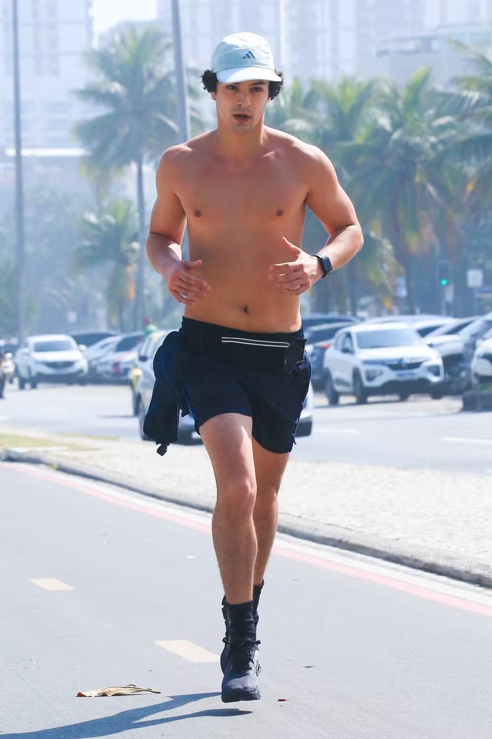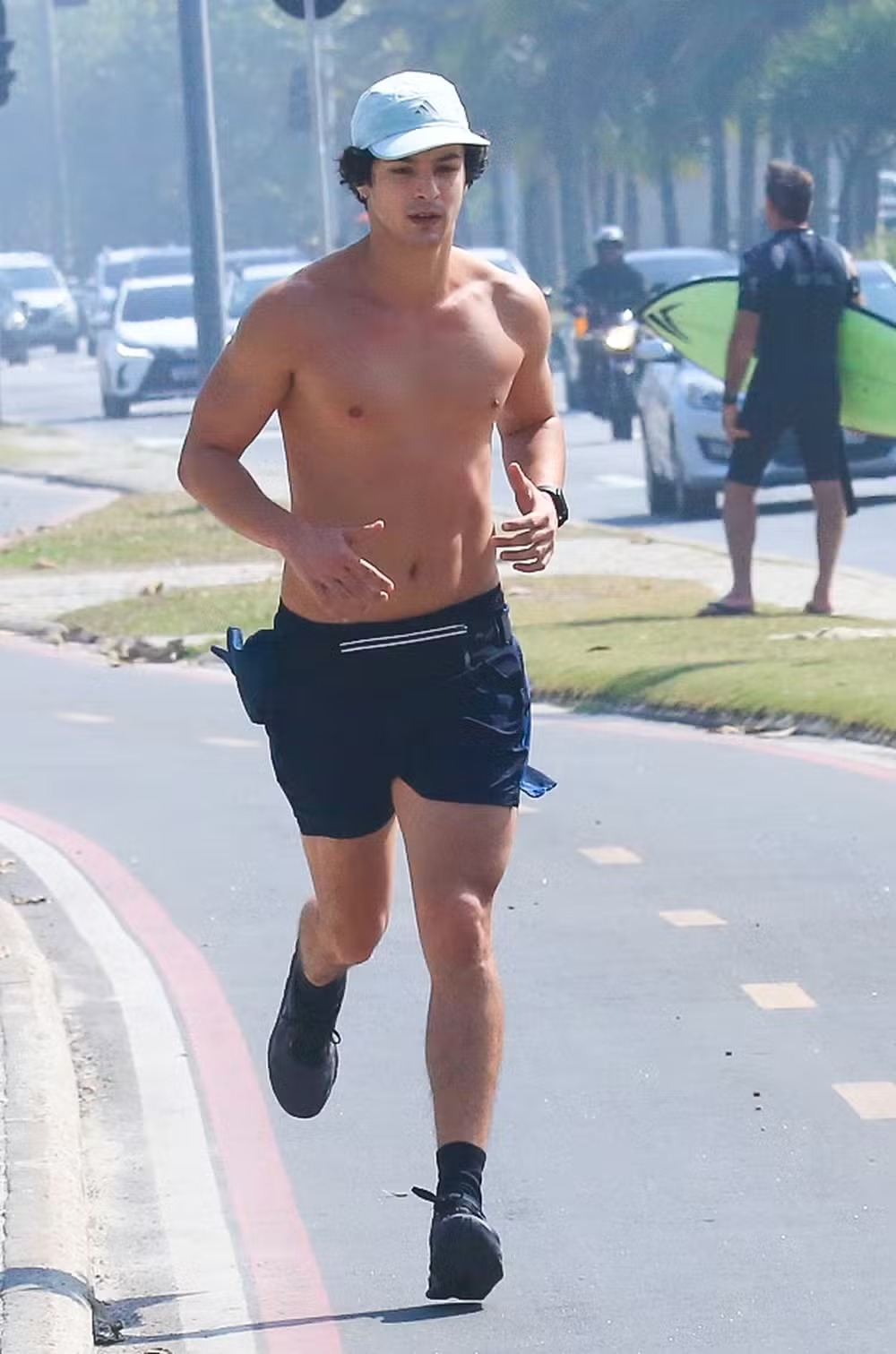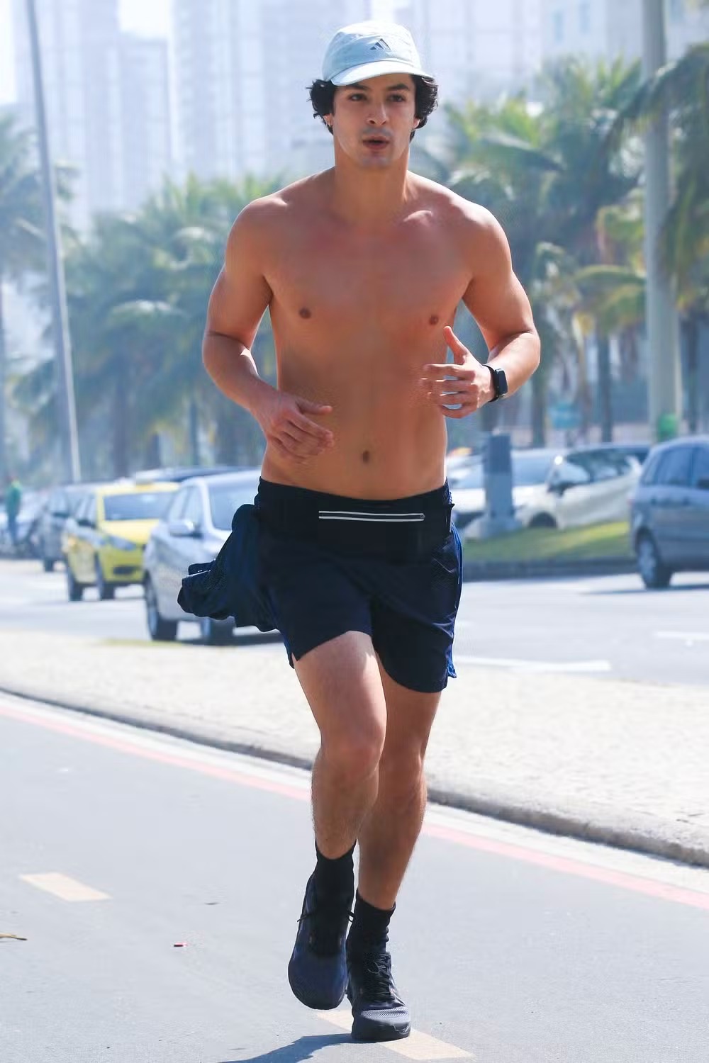 Durante o treino, Pedro surgiu sem camisa, vestindo apenas shorts preto e um boné, proteção que não deixou de lado para se resguardar do sol. Natural do Rio, o ator se mudou para São Paulo aos 18 anos, mas voltou à cidade natal por conta das gravações da novela.