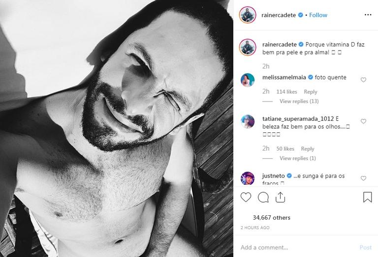 Afinal, no clique em preto e branco, Rainer Cadete pareceu estar tampando a parte íntima para tirar a selfie.