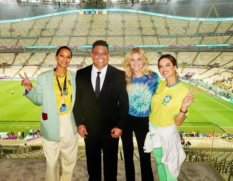 Vestidas à caráter para o jogo, as supermodelos brasileiras fizeram alguns cliques no estádio em Lusail e ainda conseguiram registrar alguns momentos ao lado de ninguém menos que Ronaldo Fenômeno e sua esposa, a também modelo, Celina Locks.