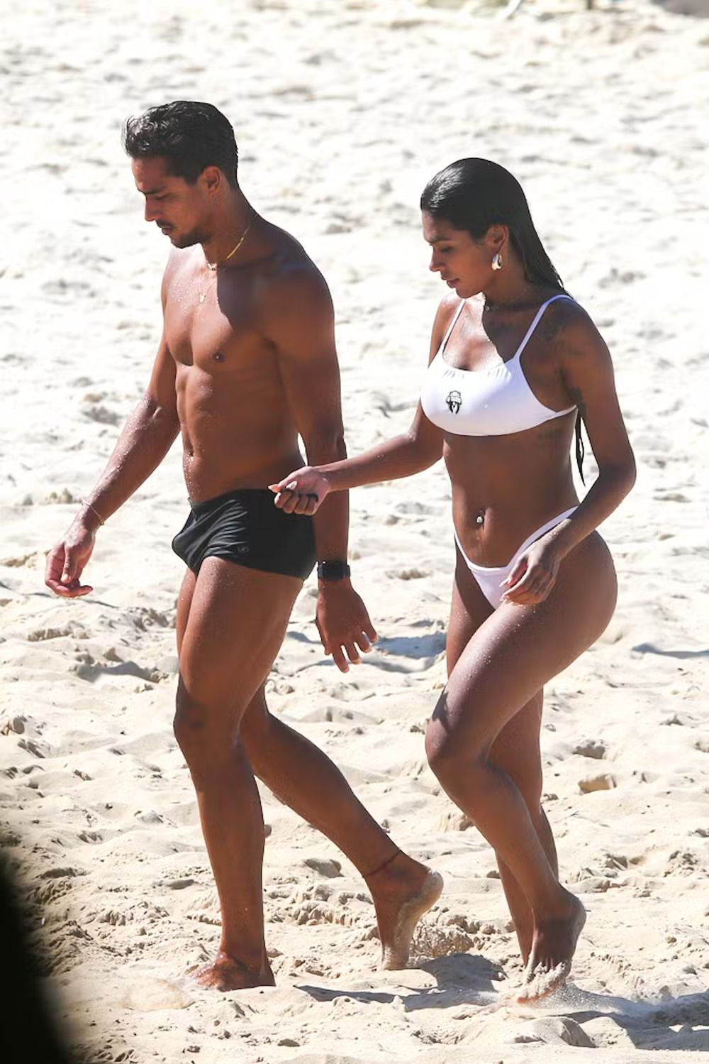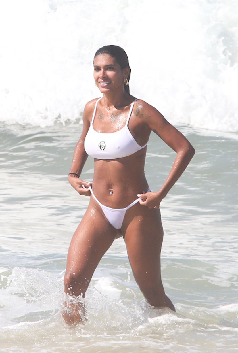 Para curtir o dia de sol, Pocah apostou em um biquíni branco, que destacou o visual da cantora enquanto ela caminhava pela areia da praia. Pelágio foi no básico que funciona e usou uma sunga preta bem justa, destacando ainda mais seu corpo.