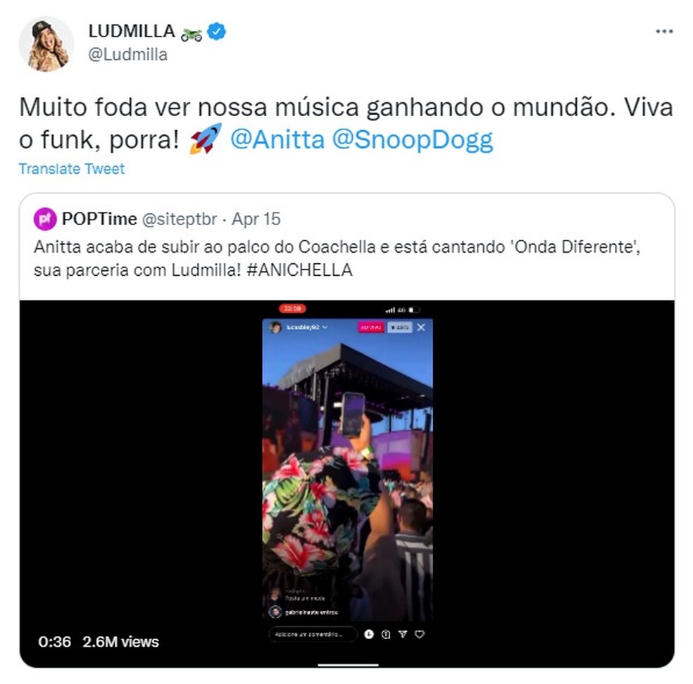 Logo que os internautas viram a apresentação, começaram a marcar Ludmilla nos posts com os vídeos da música cantada por Anitta e Snoop Dog no Coachella. Lud passou a noite desmarcando seu nome na força do ódio. Até ser demovida da missão por amigos e decidir dar o que queriam. Fonte: IG