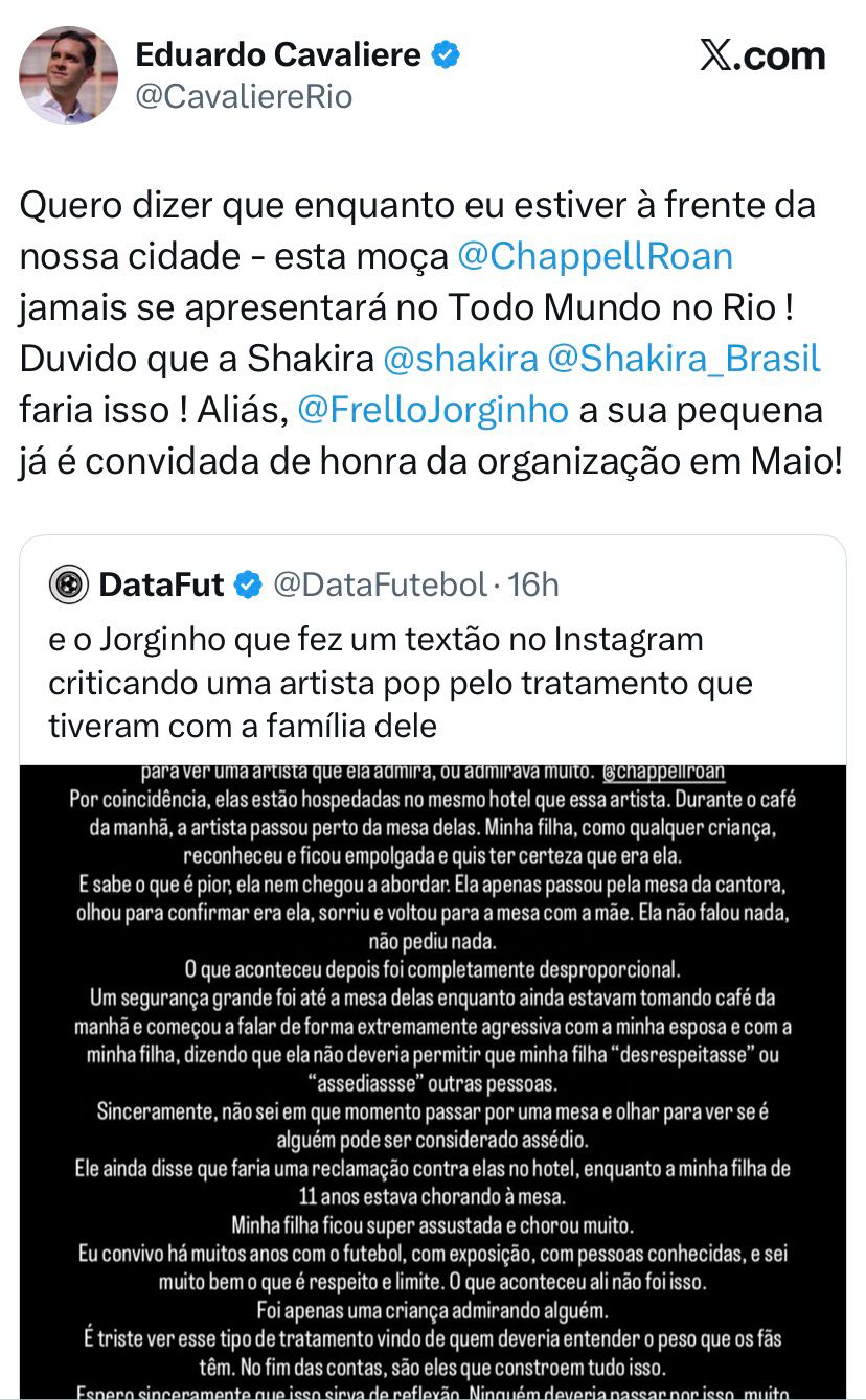 “Quero dizer que enquanto eu estiver à frente da nossa cidade - esta moça @ChappellRoan jamais se apresentará no Todo Mundo no Rio! Duvido que a Shakira faria isso! Aliás, @FrelloJorginho a sua pequena já é convidada de honra da organização em maio!”, escreveu.