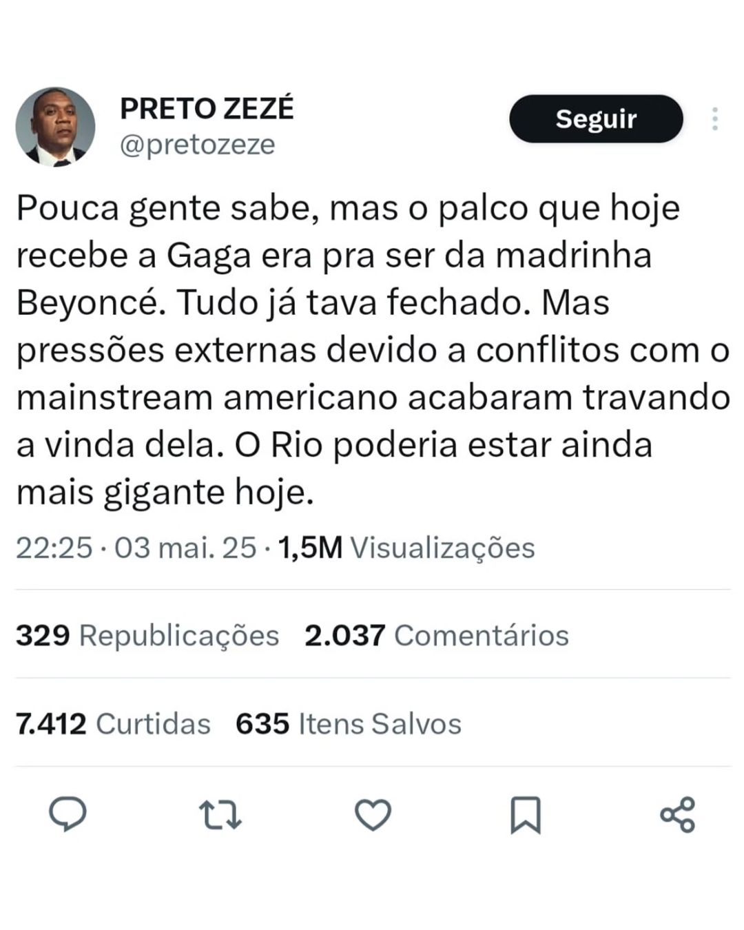 Preto Zezé, presidente global da Central Única das Favelas (Cufa), foi quem iniciou o debate nas redes sociais neste domingo (4/5), após publicar uma informação sobre o show realizado por Lady Gaga na noite anterior, sábado (3/5), na Praia de Copacabana. Segundo ele, a apresentação inicialmente teria outro nome de destaque no cenário pop internacional.