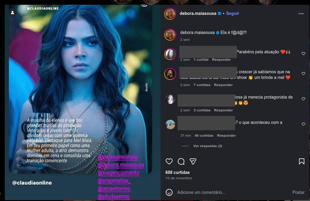 Débora continuou compartilhando homenagens e declarações às duas filhas mesmo após o desabafo, além de fotos ao lado das filhas. Recentemente, ela havia publicado diversos elogios ao trabalho de Mel como Mirna Guerra em Os Donos do Jogo, série da Netflix.