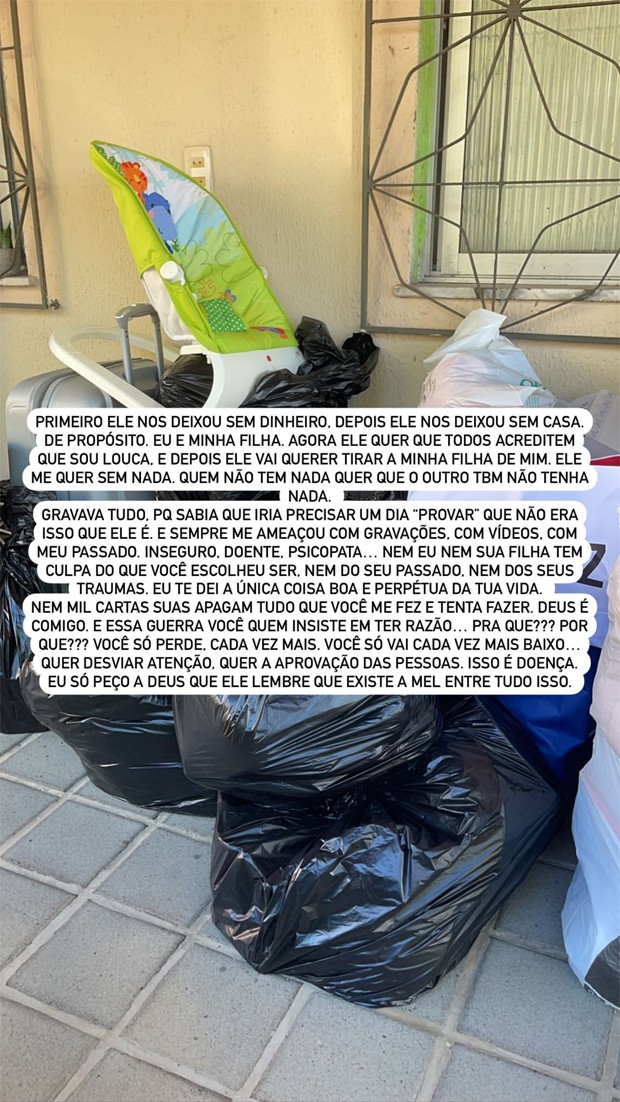 Pamella Holanda (Foto: Reprodução / Instagram) Nos stories, ela ainda mostrou uma foto com todos os seus pertences em sacos de lixo para falar sobre o fato de estar sem moradia no momento. "Primeiro ele nos deixou sem dinheiro. Depois, ele nos deixou sem casa de propósito. Eu e minha filha. Agora ele quer que todos acreditem que sou louca. Depois, ele vai querer tirar a minha filha de mim. Ele me quer sem nada. Quem não tem nada que quer que o outro não tenha, também", disse ela na legenda.